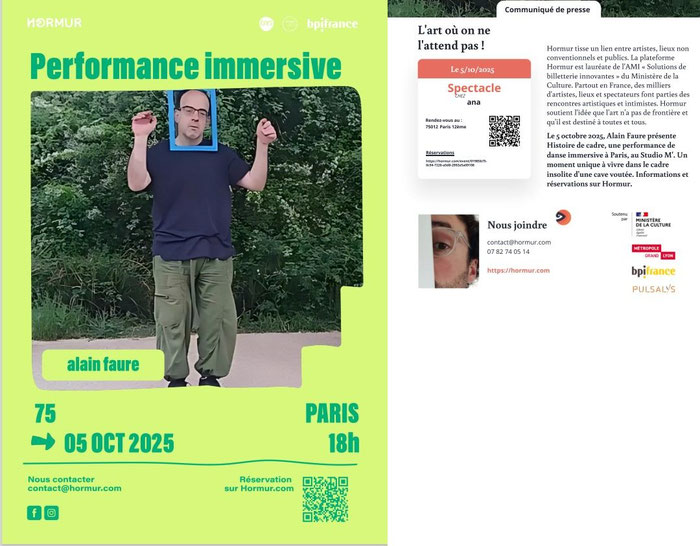 Histoire : L'artiste est là. Il entre sur scène en lenteur avec un cadre à la main. Il le dépose en commençant un regard périphérique.